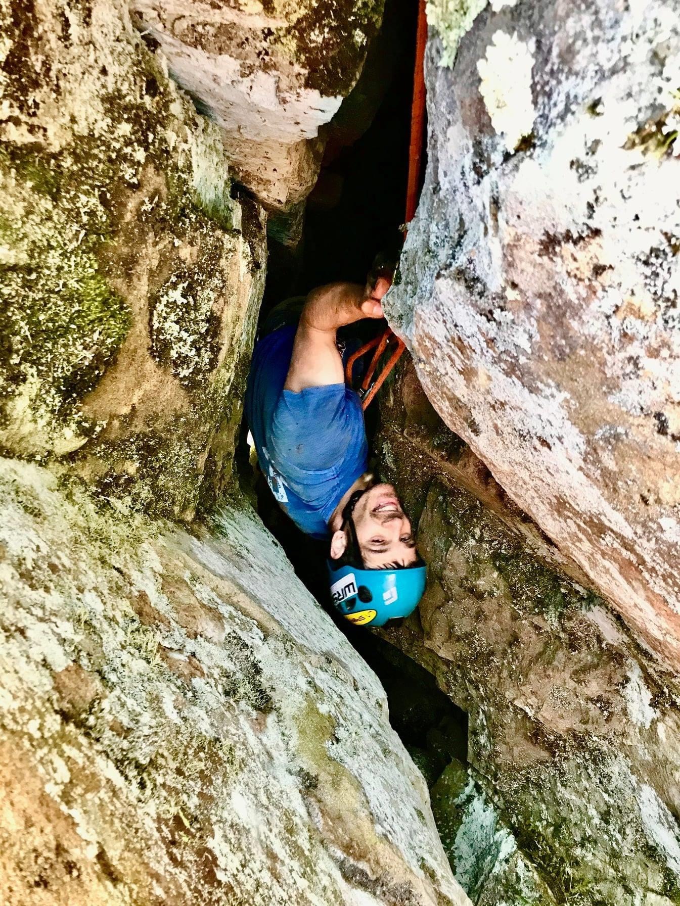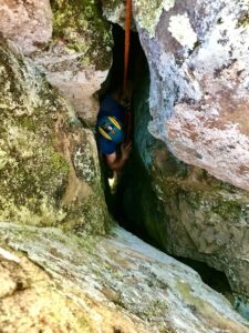Sandro depended solely on his rope and equipment for his safety in this fully suspended experience. Little did anyone know, he was fighting his own demons as the confined space made him feel claustrophobic and he had a fear of being buried alive. The crevice narrowed to a space of about 18 inches. It was very dark, and the rock was wet to the touch. When he felt anxious, he focused on the confidence he had in the set-up of his gear. This helped him overcome his fear and carry on with the task at hand.